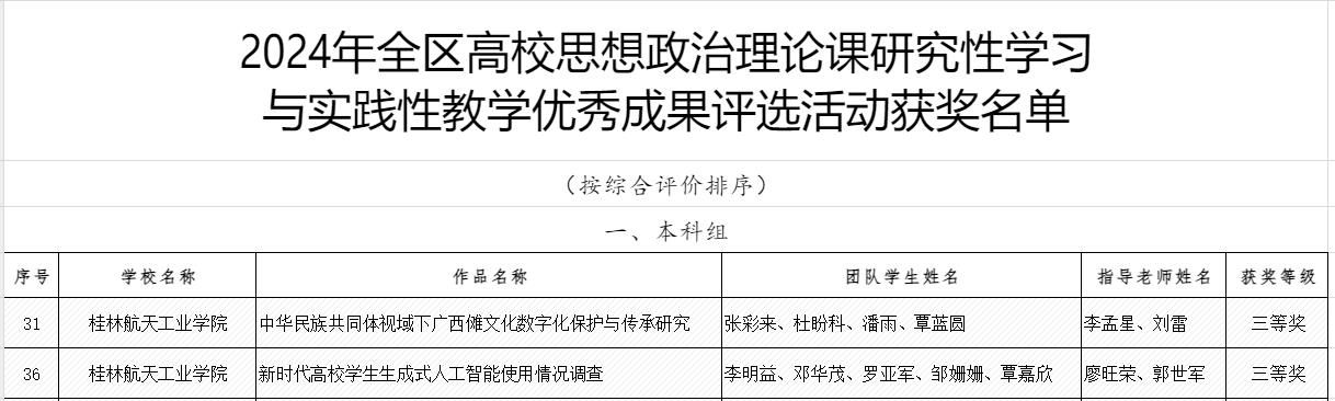 近日,由自治区教育厅主办的2024年全区高校思想政治理论课研究性学习与实践性教学优秀成果评选活动圆满结束。我院廖旺荣、李孟星两位老师分别指导的《新时代高校学生生成式人工智能使用情况调查》《中华民族共同体视域下广西傩文化数字化保护与传承研究》两项作品均获得本科组三等奖。下一步,我院将继续深化思政课改革与创新,不断提升思政育人质量,为培养德才兼备、全面发展的高素质人才而不懈努力。