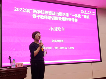 7月2日-7月5日,我院教师杨元妍教授参加2022年广西学校思想政治理论课“一体化”建设骨干教师培训班及集体备课会。4天的培训包括大中小学思政课落实“大思政课”理念的探索、学校思政课多元评价体系的构建、学校思政课“一体化”建设—教学方法创新思路等10场报告,并举行了从课程、教学、评价、组织机制角度探讨思政课“一体化”思路的研讨会。