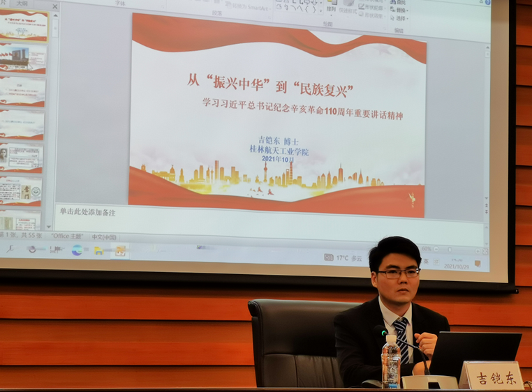 为深入学习贯彻习近平总书记在纪念辛亥革命110周年的重要讲话精神,10月29日下午,我院教师吉铠东博士应校党委组织部的邀请,在飞天楼520为各基层党支部书记、党课教师,作了题为《从‘振兴中华’到‘民族复兴’——学习贯彻习近平总书记纪念辛亥革命110周年重要讲话精神》的主题报告,吉老师讲述了辛亥革命的重大历史意义、中国共产党与孙中山革命事业的关系,阐明了中国共产党接续孙中山的未竟事业,为实现中华民族的伟大复兴的不懈奋斗。