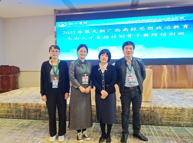 10月23日至29日,2021年第九期广西高校思想政治教育杰出人才支持计划骨干教师培训在梧州举行,我院教师庾虎、玉素萍、张君和李宇萍参加了培训。