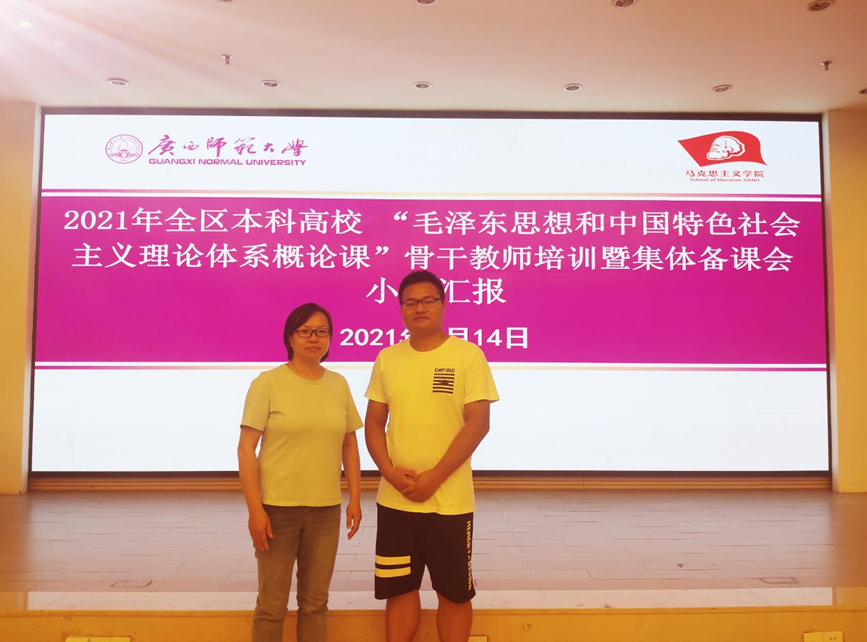 为了进一步提升我区高校思想政治理论课教师队伍建设,不断提高思想政治理论工作水平,由自治区教育工委、教育厅主办,广西师范大学伟德bv1946官网承办的2021年全区本科高校“毛泽东思想和中国特色社会主义理论体系概论课”骨干教师培训暨集体备课会于9月11日至16日在桂林举行,我院教师张耀荣、罗辉参加了培训会。