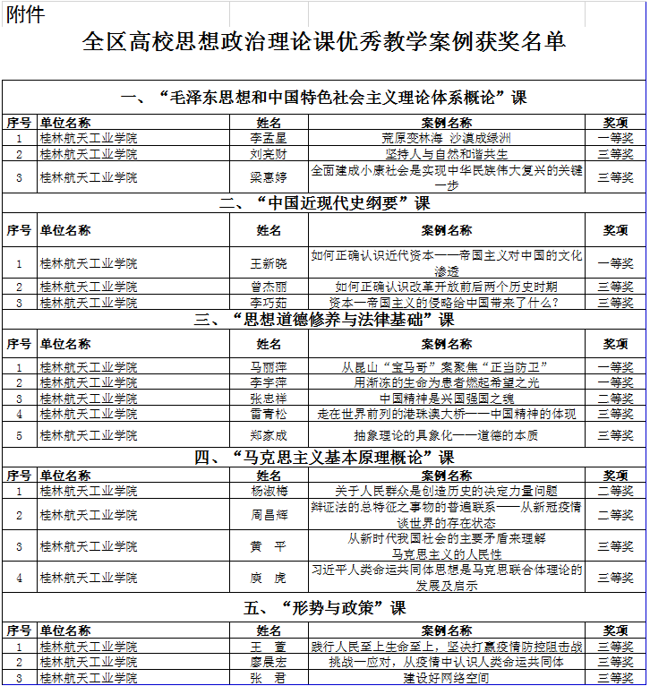 近日,根据《自治区教育厅关于公布全区高校思想政治理论课优秀教学案例名单的通知》(桂教思政〔2021〕10号),我院共有18项教学案例获奖,其中一等奖4项,二等奖3项,三等奖11项。