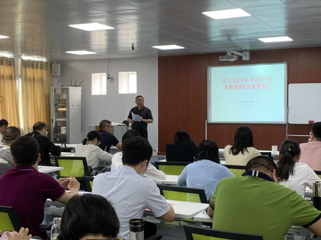 会上,党支部负责人从“一个总目标”“四个突出特点”“四个总要求”等方面,深入解读和传达了习近平总书记关于解放思想深化改革凝心聚力担当实干,建设新时代中国特色社会主义壮美广西的重要指示和重要讲话精神,并结合学院实际指出,党员教师们要深入领会和准确把握习近平总书记视察广西的重要讲话和重要指示精神,及时将重要讲话和重要指示的相关内容融入到思政课教学和科学研究中,让重要讲话和重要指示精神成为思政课的生动教材和指导科学研究的重要指南。