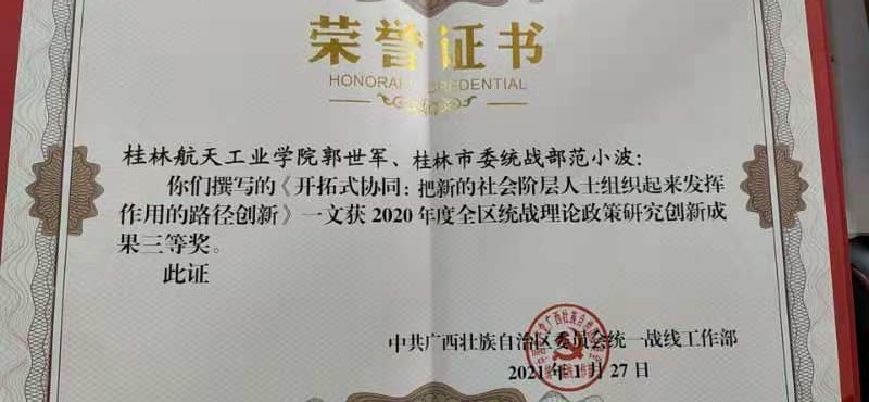 我校教师郭世军博士和桂林市统战部范小波联合撰写的《开拓式协同:把新的社会阶层人士组织起来发挥作用的路径创新》,获得2020年度全区统战理论政策研究创新成果三等奖。