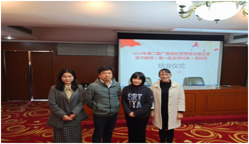 2020年11月29日至12月5日,由广西壮族自治区教育厅主办、广西高校思想政治理论课教师培训研修中心(广西大学)承办的2020年第二期广西高校思想政治理论课骨干教师(第一批支持对象)培训班在北海召开,我院庾虎、玉素萍、李宇萍、黄平4名教师参加此次培训。