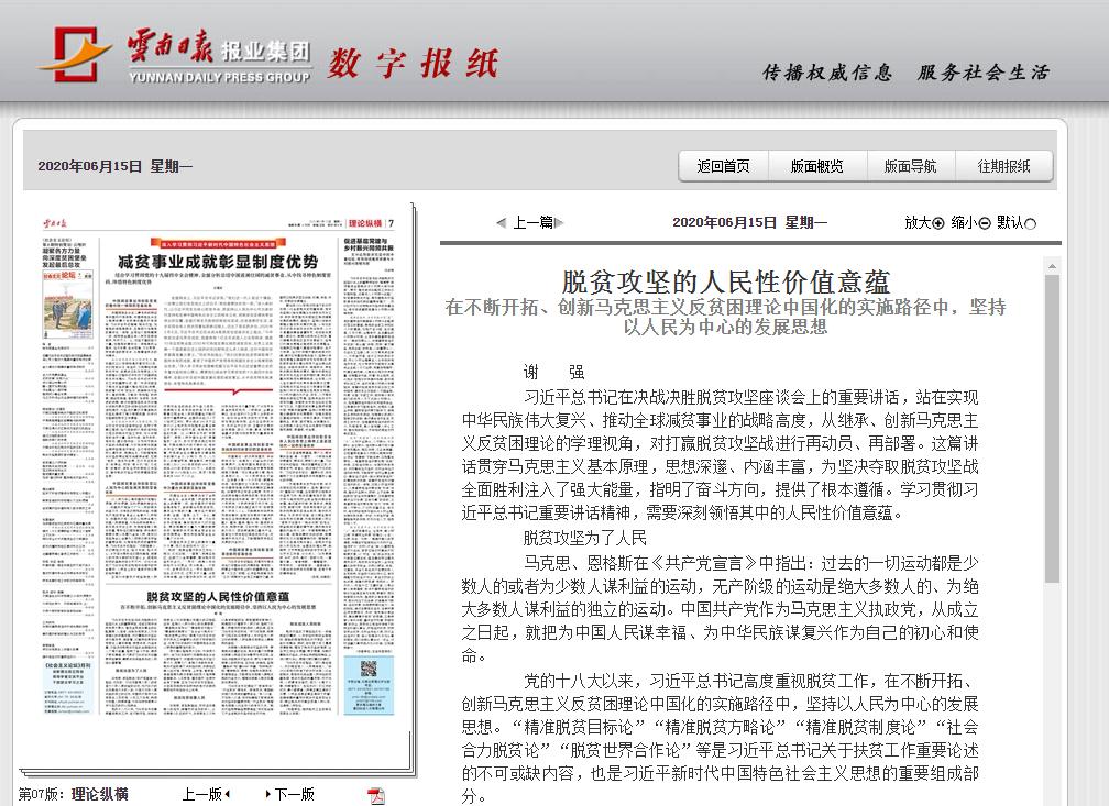 《云南日报》理论版刊发我院谢强老师的文章《脱贫攻坚的人民性价值意蕴》,现予以全文转发。