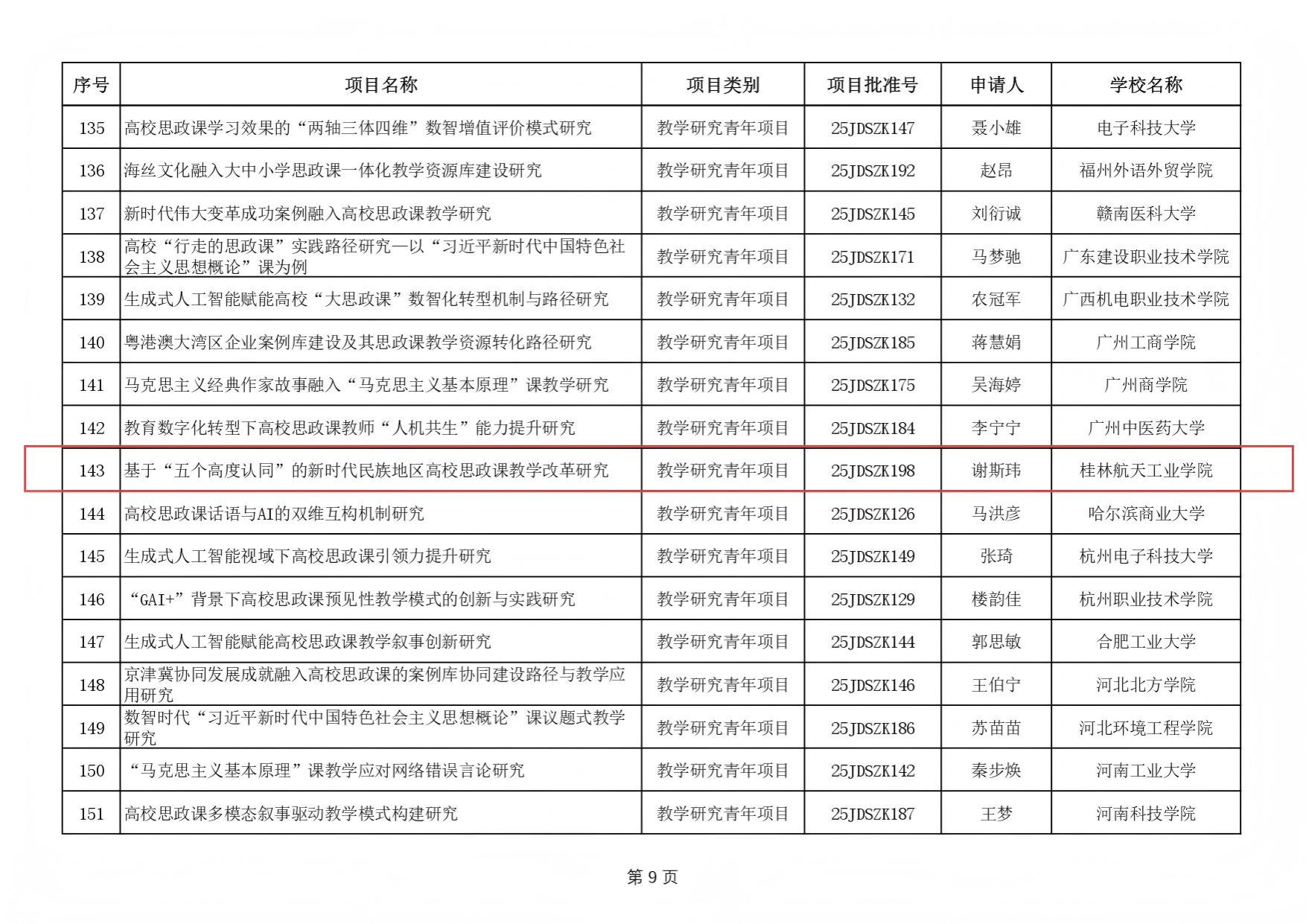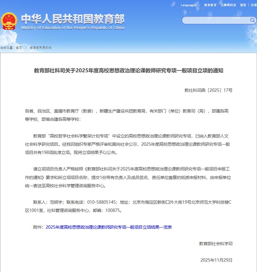 近日,教育部社科司发布了2025年度高校思想政治理论课教师研究专项一般项目立项通知,伟德bv1946官网教师谢斯玮申报的《基于“五个高度认同”的新时代民族地区高校思政课教学改革研究》获批立项。据悉,本次教育部高校思想政治理论课教师研究专项一般项目全国共有198项批准立项。此次立项,是学校深入落实立德树人根本任务,积极推动思政课建设内涵式发展的重要体现。